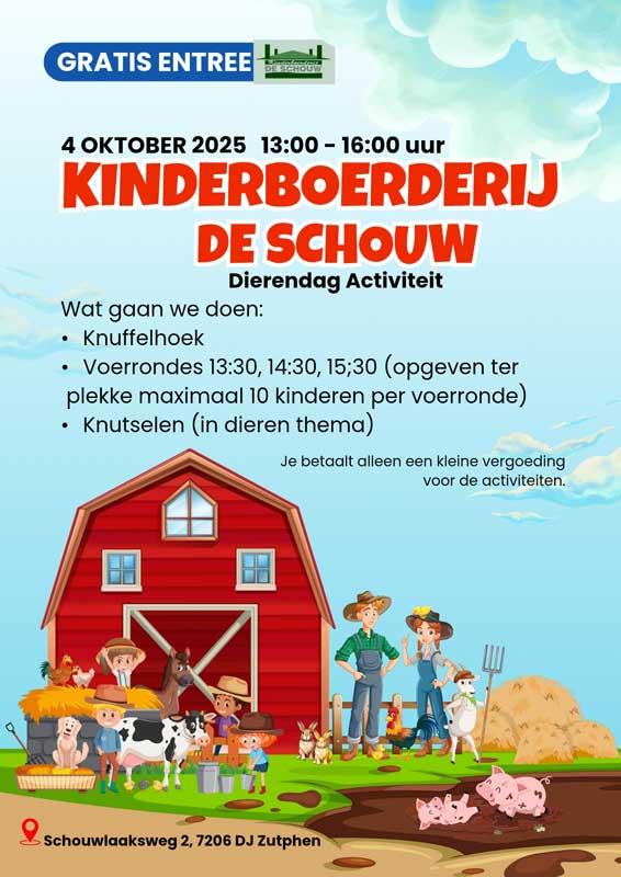 Welkom op de website van kinderboerderij de Schouw in Zutphen. Op onze kinderboerderij aan de Schouwlaaksweg te Zutphen zijn veel diersoorten te bewonderen en is er voor de kinderen een nieuwe speelgelegenheid.