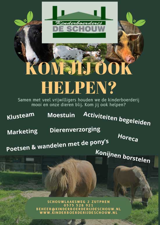 Dierverzorgers vanaf 18 jaar.  Na een inwerkperiode en kun je dan zelfstandig werken, dan mag je dieren verzorgen, onder begeleiding van de beheerders. Gaat dit alles goed, dan is een kleine vergoeding mogelijk. Aanmelden en info via beheer@kinderboerderijdeschouw.nl of 0575528921.